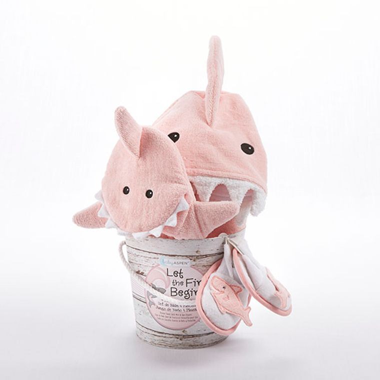Four-piece bath gift set features soft pink terry hooded towel with smiling shark's face and 3-D accents including teeth, fin and tail; soft shark bath mitt with black appliqued eyes and 3-D features; and two spa slippers with sea pink shark appliques Hooded towel measures approximately 30" square and hood is 6" deep Packaged gift-ready in a faux driftwood bucket with aquatic-themed printed band and nautical braided rope handle Size 0-9 months Machine-washable, velour cotton terry