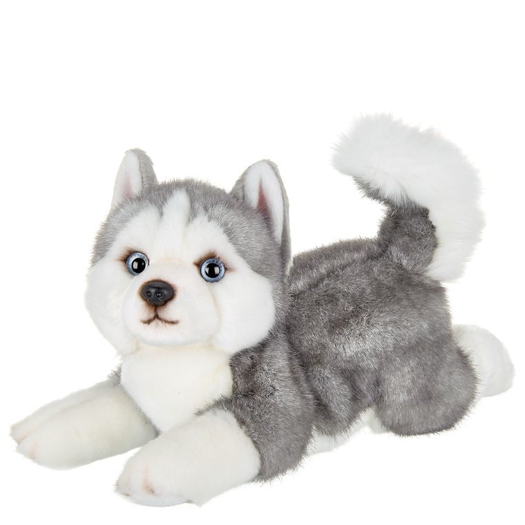 Adorably cute grey and white Husky puppy dog plush toy with soft fur, sparkling eyes, and a soft floppy body, 15” long