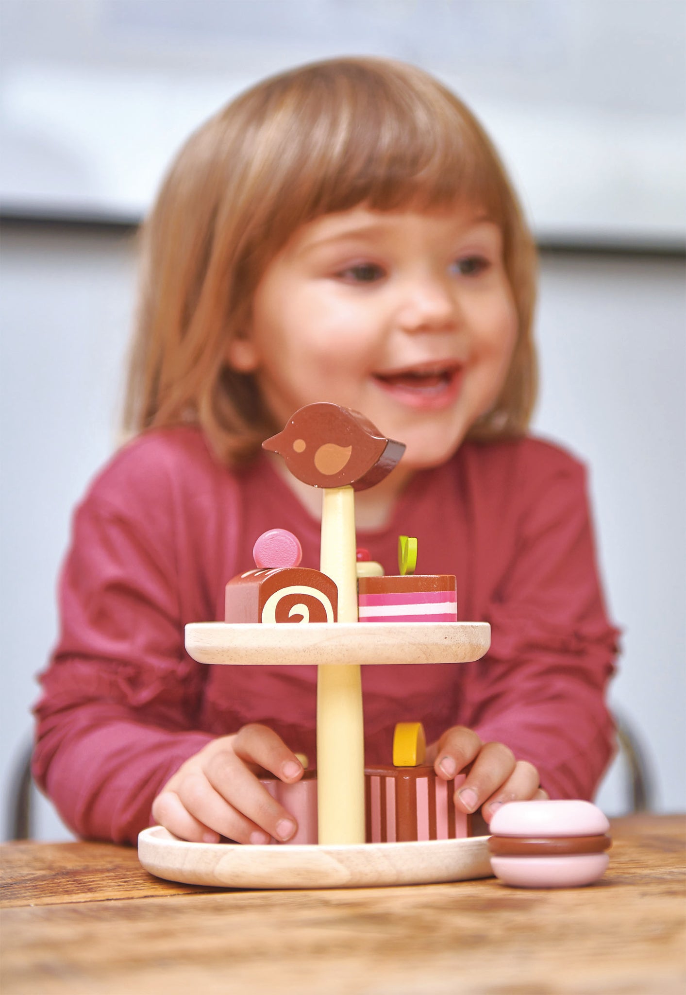 A yummy collection of 8 chocolate bonbons made from solid wood and painted in various chocolate and raspberry colors. All contained on a natural wood 2 tier cake stand that is topped with a glossy chocolate tenderleaf bird! All the petit fours are decorated in a different way with lots of attention to detail.