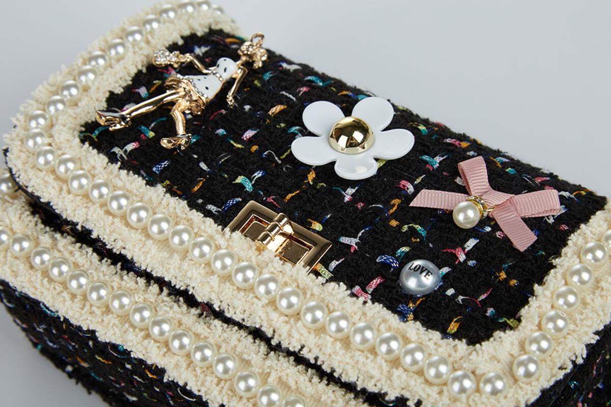 DOE A DEAR- BLACK TWEED LADY, FLOWERS, AND PEARLS PURSE IN LARGE