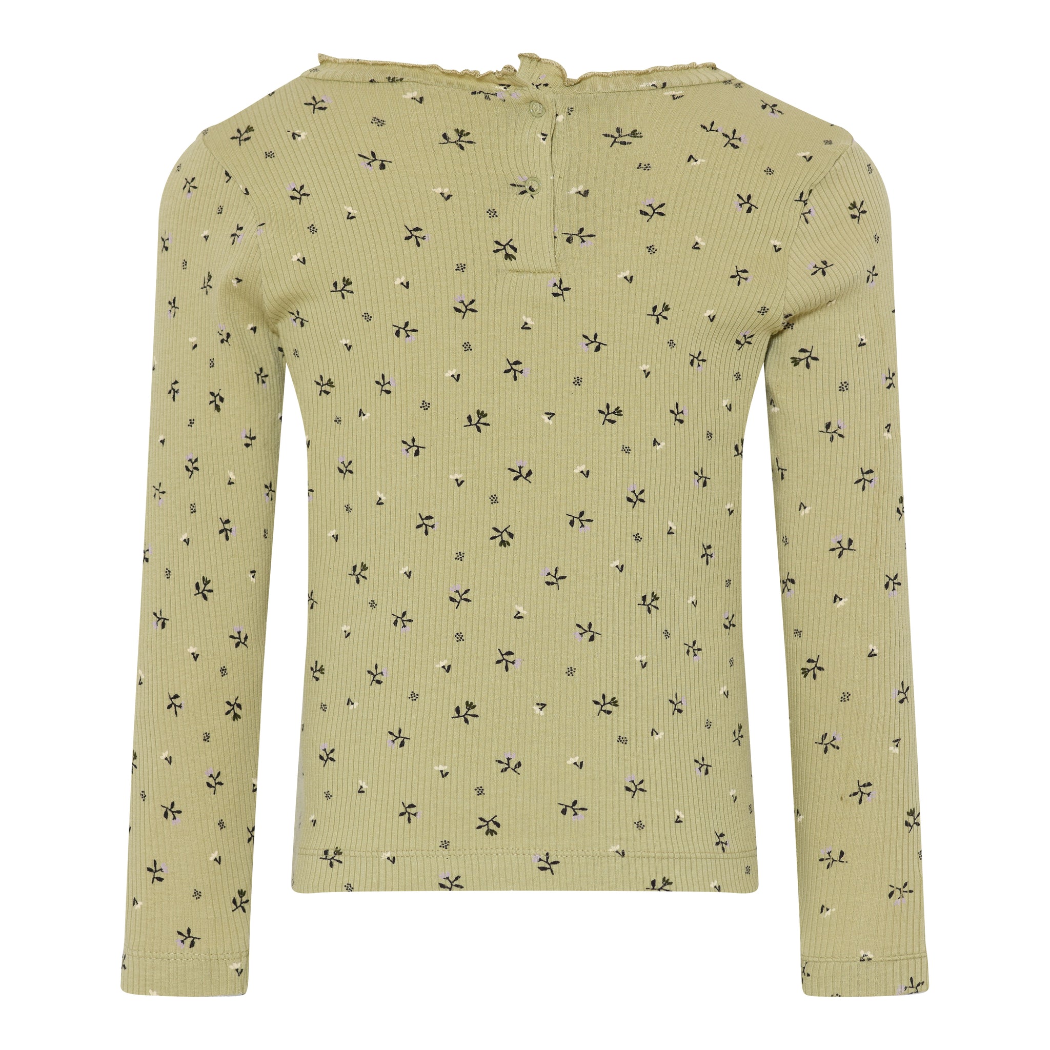 The t-shirt is of soft rib quality. It is yellow and all-over-printed with small flowers. Frills as the neckline finish. Made in organic cotton that feels soft and comfortable.