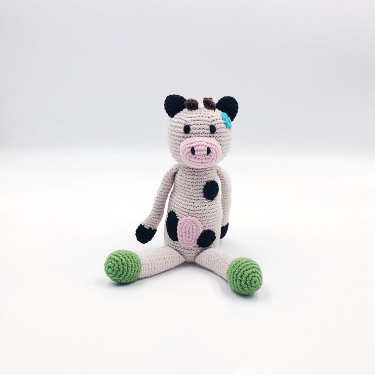 Mooove on over and let the party begin! This cow has been planning hours of fun and can't wait to meet her new friend! Handmade with soft organic cotton yarn, this knit toy is super cuddly. The rattle inside gives a soft jingle when shaken.