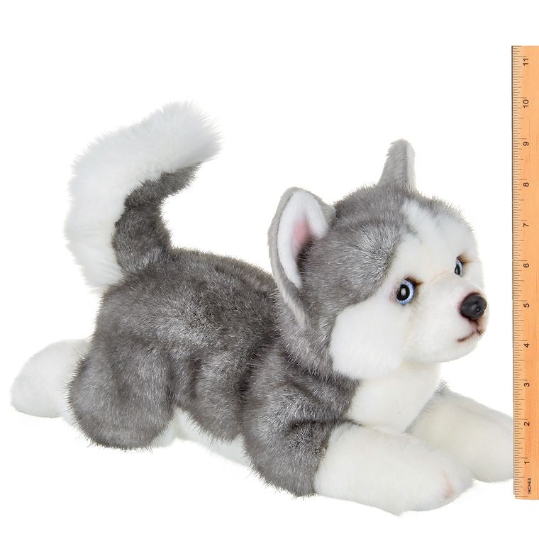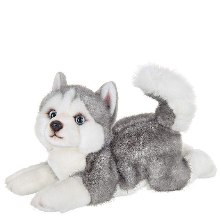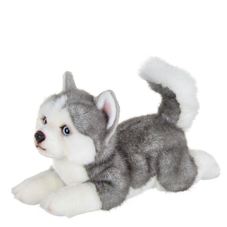 Adorably cute grey and white Husky puppy dog plush toy with soft fur, sparkling eyes, and a soft floppy body, 15” long
