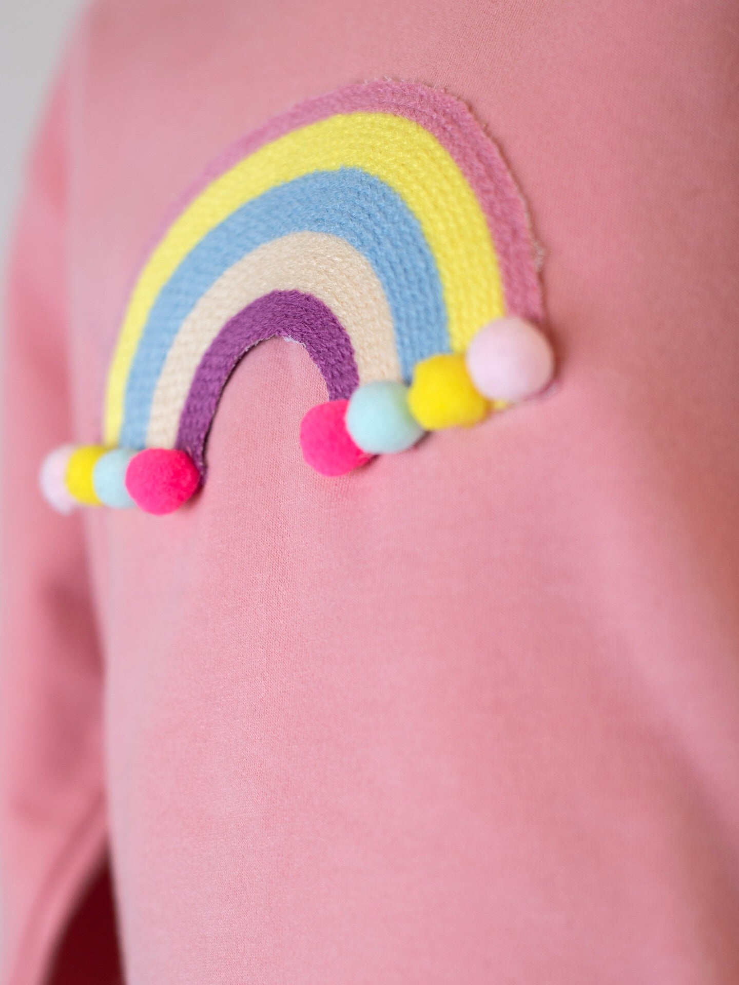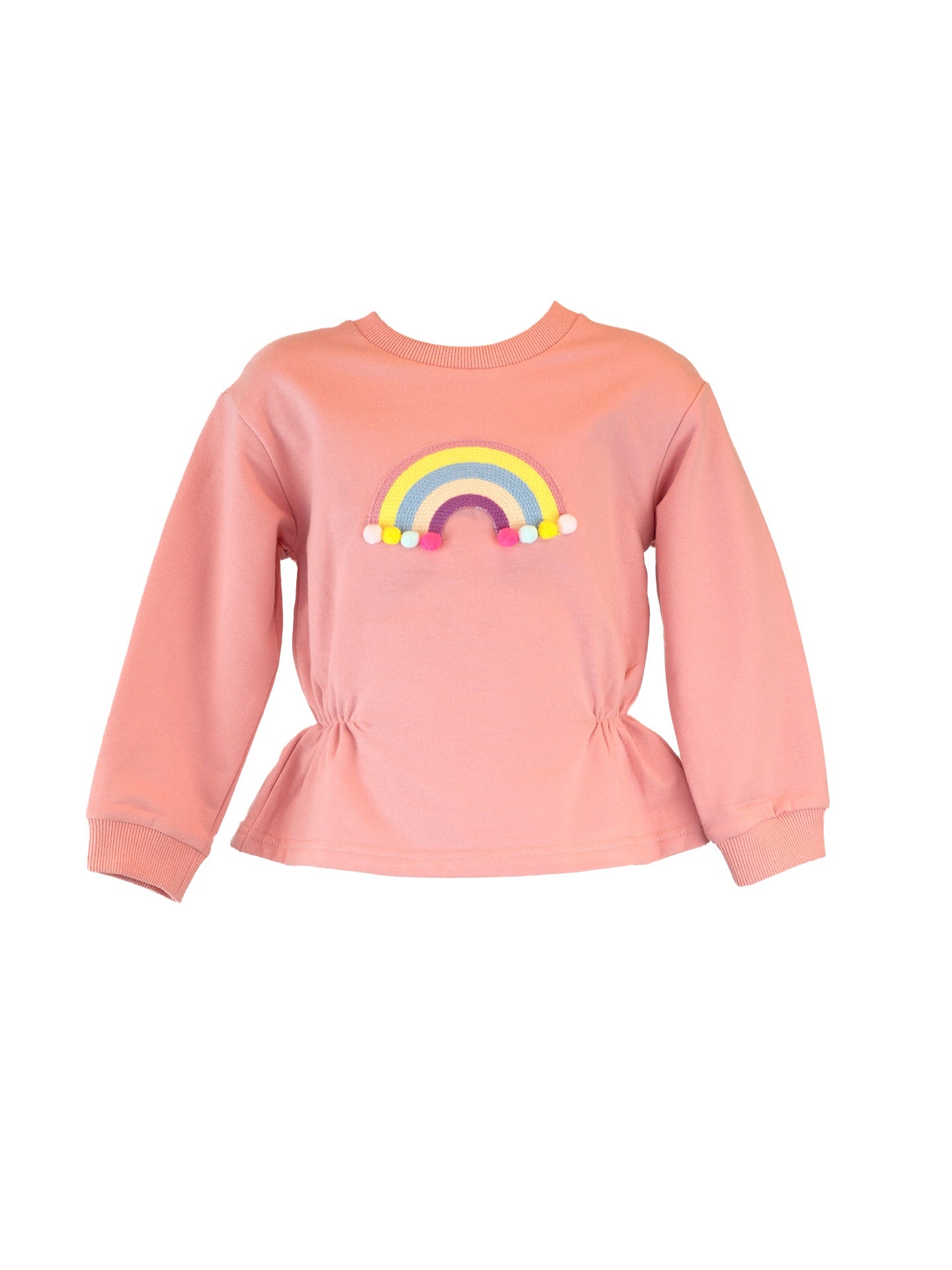L/S PINK CREWNECK SWEATER W/ WAIST CINCH AND RAINBOW POM POMS.