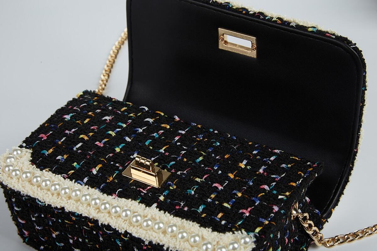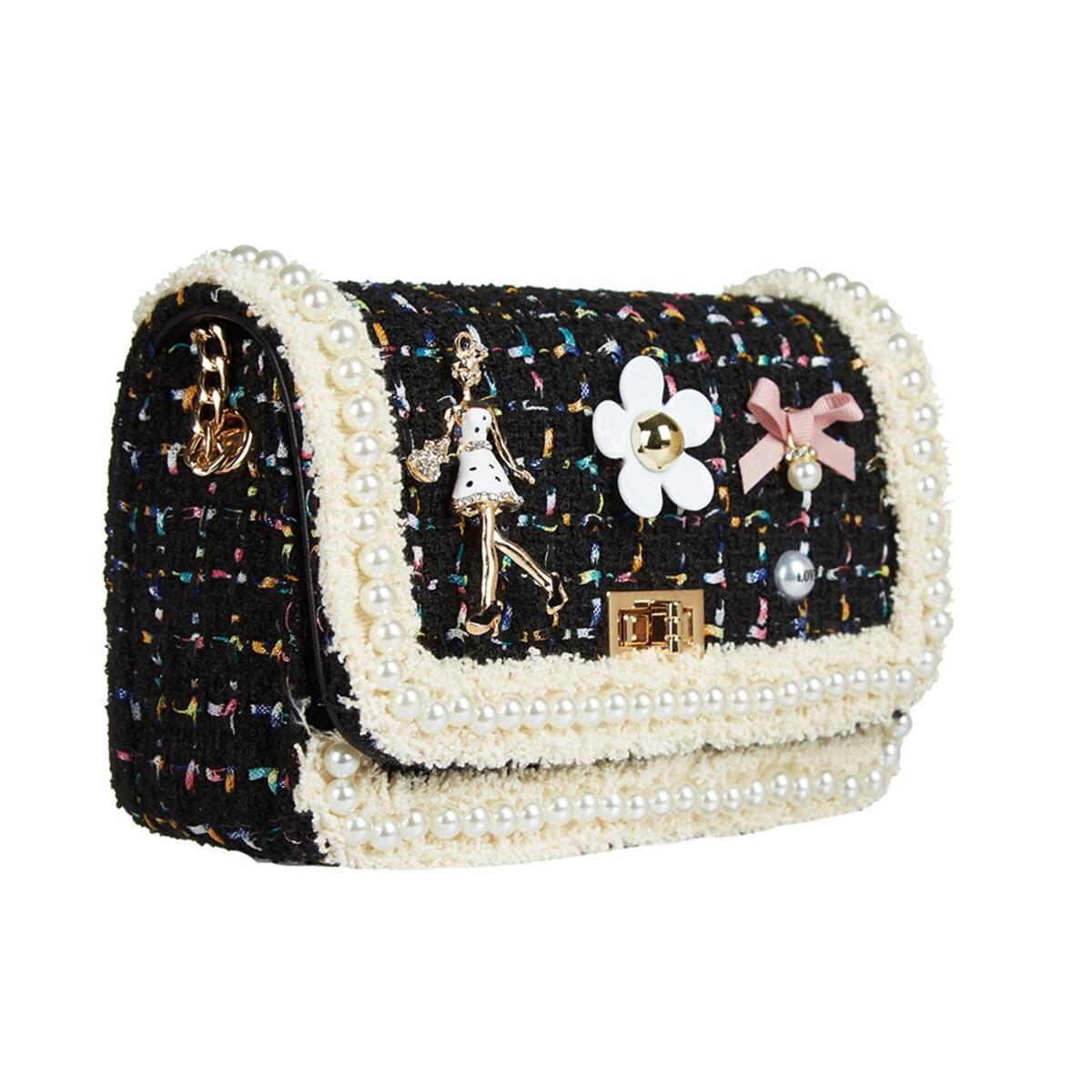 DOE A DEAR- BLACK TWEED LADY, FLOWERS, AND PEARLS PURSE IN LARGE