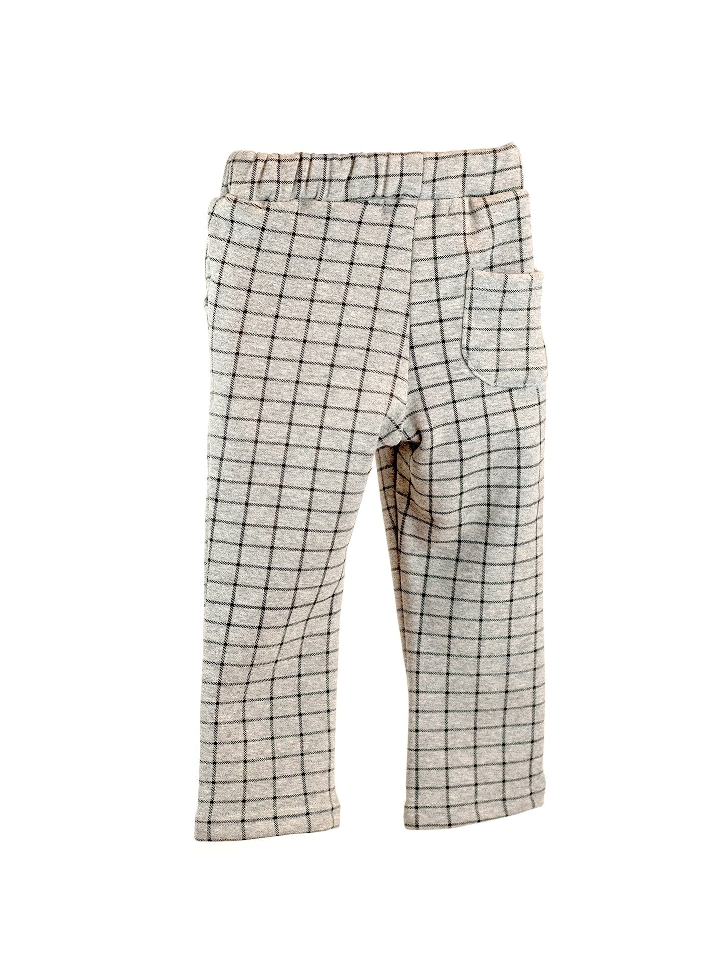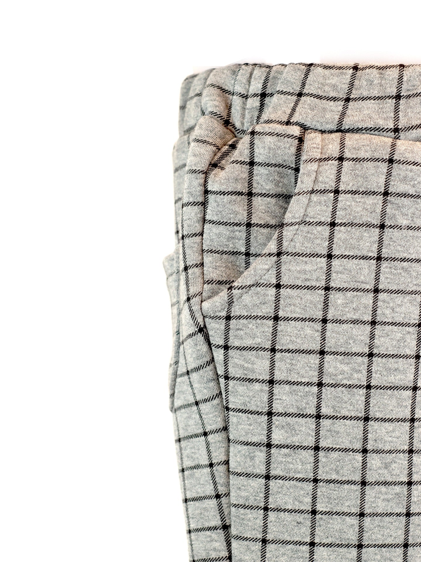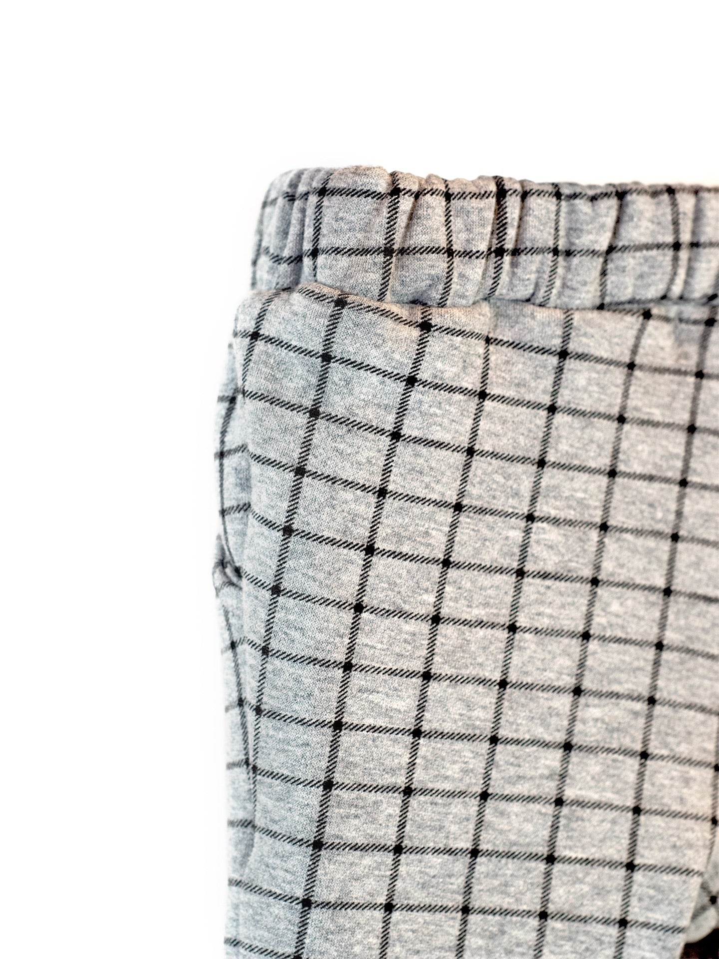 HEATHER GREY CHECKERED PANTS WITH ELEASTIC WAISTBAND, AND KNEE PATCHES.