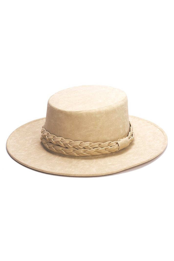 This hat is inspired by the White Horse which represents its wildness, freedom and sense of journey. It is made of synthetic ivory leather which is swathed with a matching double braid trim. The perfect hat for travel and leisure.